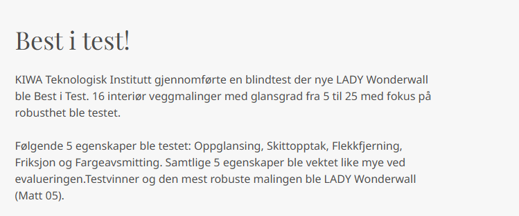 Lady Wonderwall fra Jotun er BestiTest og markedets mest robuste malingLADY Wonderwall er spesielt godt egnet til overflater som stiller høye krav til vaskbarhet og rom som utsettes for tøff bruk. LADY Wonderwall har suveren vaskbarhet, en flekkavvisende og meget slitesterk overflate og gir ingen skjolder etter vask. Gir garantert dekk i to strøk. Denne veggmalingen fra Jotun gjør det enkelt å holde veggen pen over tid. De unike egenskapene gir en vakker, robust og flekkavvisende overflate som holder seg vakker lenge. Til slette vegger innendørs i tørre rom som bygningsplater/gipsplater, overmalbar tapet, vev, puss, betong og sparkelmasse. Glansgrad 05 * Vakker, matt og robust * Varig vakkert, matt utseende * Ekstremt slitesterk * Meget flekkavvisende * Dekkgaranti Til vegger av trepanel, anbefales LADY Supreme Finish.