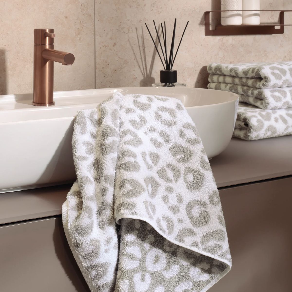 Med sitt delikate leopardmønster i varme naturtoner, gir dette håndkleet badet ditt et sofistikert og moderne uttrykk.
