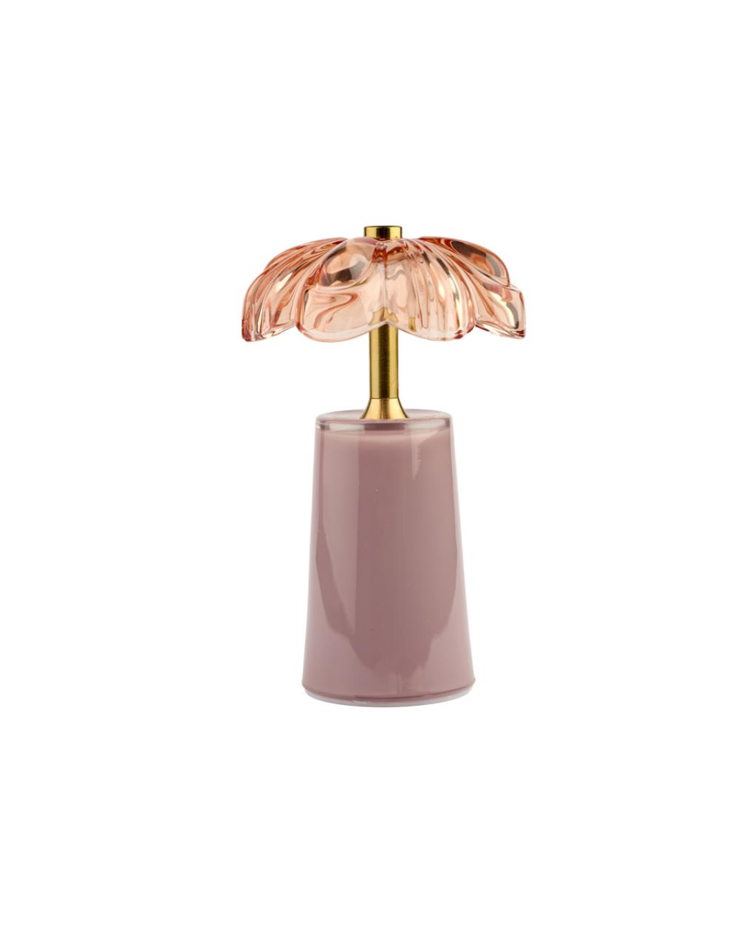 Den støvrosa basen og de gylne detaljene gir lampen et sofistikert uttrykk som passer perfekt i en moderne, feminin interiørstil.